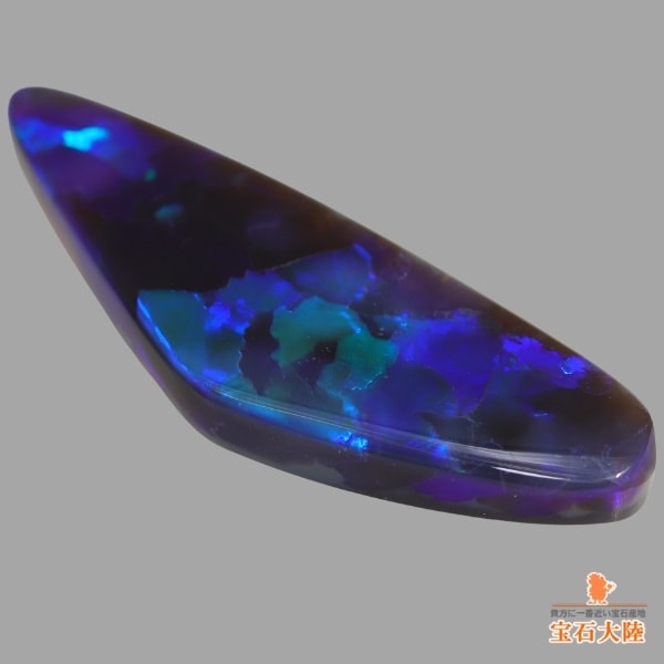- コメント:大きな斑紋の景色が素晴らしいルースで、青が綺麗なブラックオパール好きとしては実物を見た瞬間に買わなければと思ってしまいました。側面もオパールの厚い層が楽しめ、裏側の母岩もブラックとグレーの生地が瑪瑙の模様のように綺麗に見えるため、加工にはこだわりたいところです。このルースと相性が良いスターサファイアもお迎えできたので、次こそはお仕立てを…!